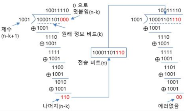 - 미리 정의된 생성 다항식 n으로 전체 데이터를 나누어 나머지를 검사한다.