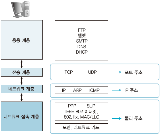 - 운영체제의 네트워크 카드와 디바이스 드라이버 등과 같이 하드웨어적인 요소와 관련되는 모든 것을 지원하는 계층