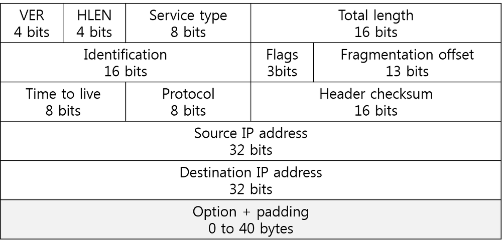 - 헤더의 길이는 최소 20바이트부터 최대 60바이트의 크기를 가지기에 0부터 15까지의 수를 표현할 수 있는 4비트를 가지고 60바이트까지 표현하기 위해서 4를 곱한다.
