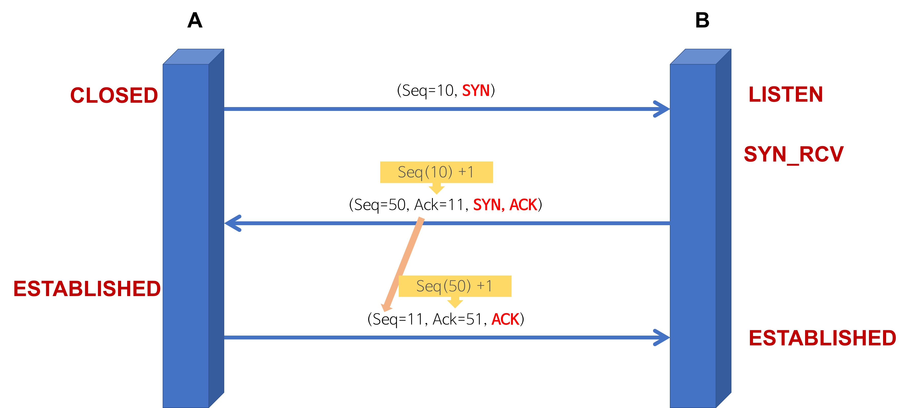 - A -> B: SYN(최초 연결)