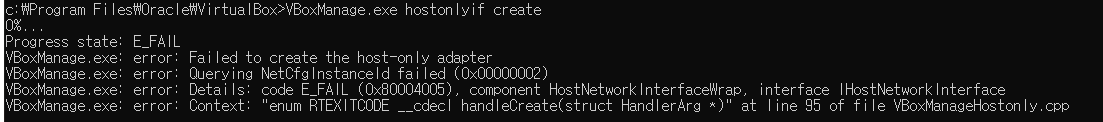 해당 어댑터 전부 지워주고 VirtualBox Host-Only Ethernet Adapter 를 다시 설정하니 성공