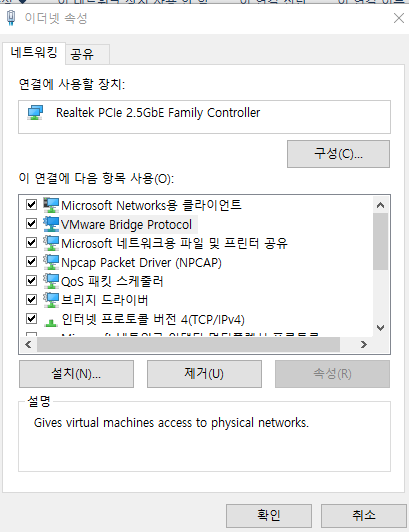 VMware Bridge Protocol 삭제 불가 참고