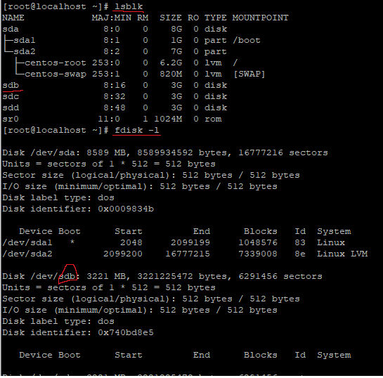 테스트를 위해 추가한 3GB 디스크 정보 확인 -> sdb