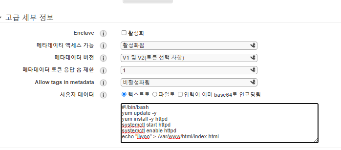 "인스턴스 세부 정보 구성" 하단에서 간단하게 쉘스크립트를 삽입하여 인스턴스 첫 부팅 때 실행하게 한다.