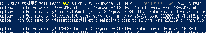 위의 예시는 명령어를 통하여 cli_test 디렉토리 내부에 파일과, 폴더의 하위 파일들 까지 모두가 읽을 수 있도록 권한을 주고 버킷에 올린 것이다.