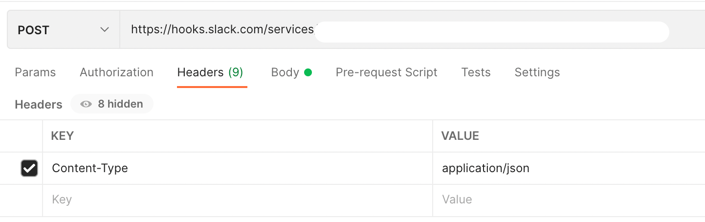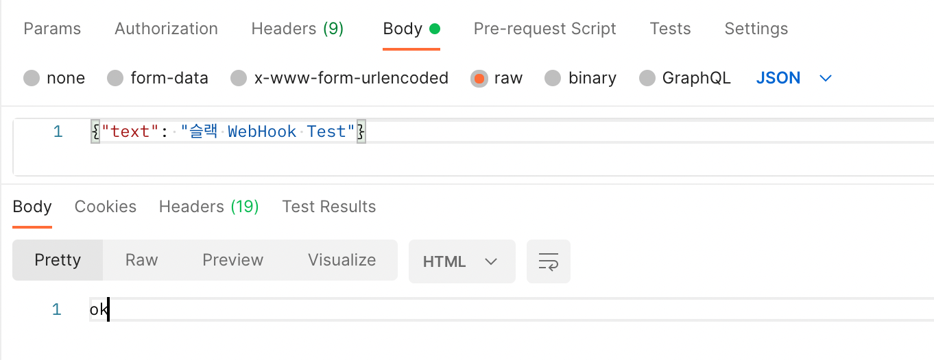 설정한 WebHook API 가 잘 동작하는 지 웹후크 URL 가지고 PostMan 으로 확인합니다.