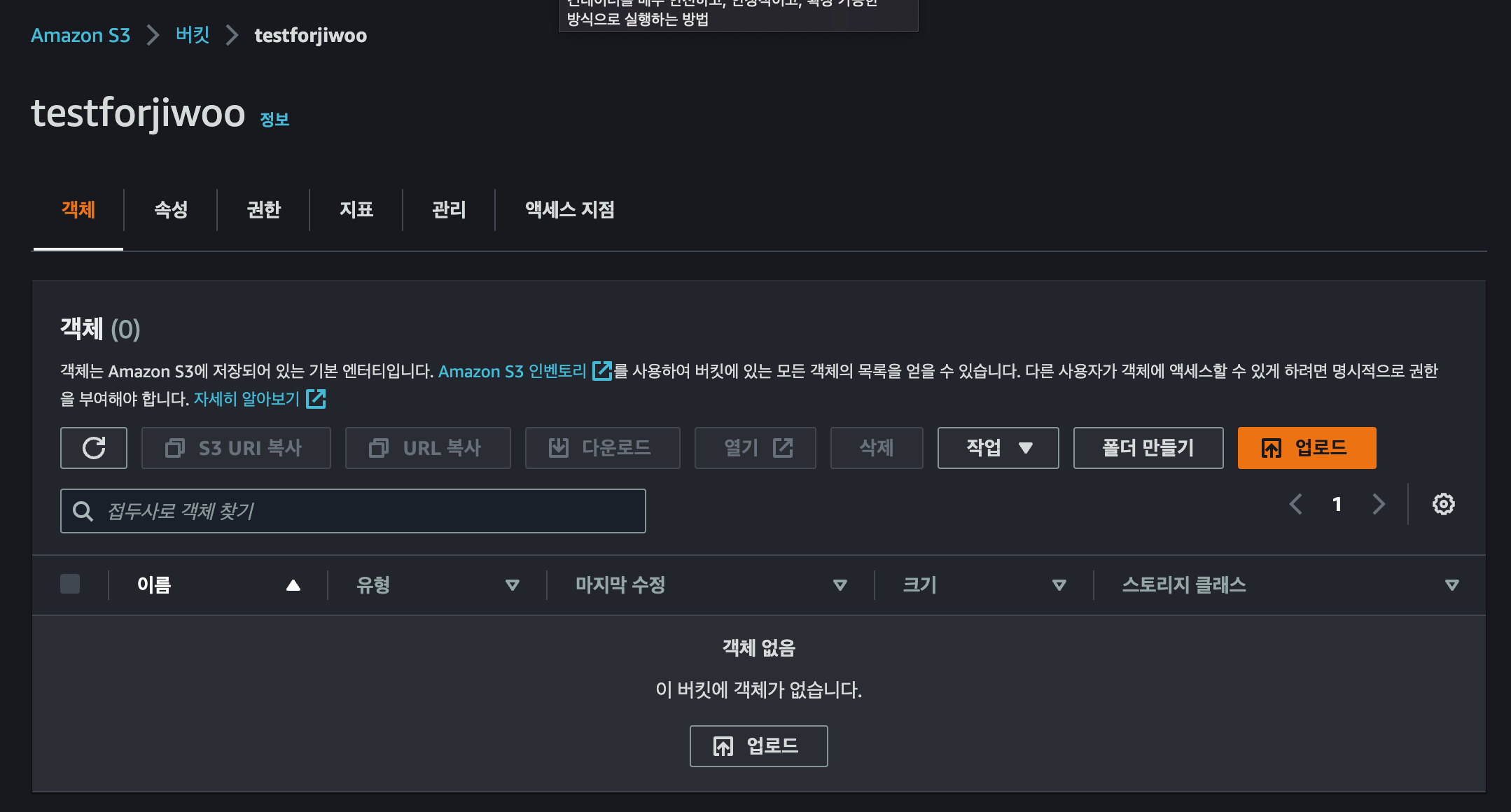 테스트를 위해 버킷과 객체를 준비해줍니다.