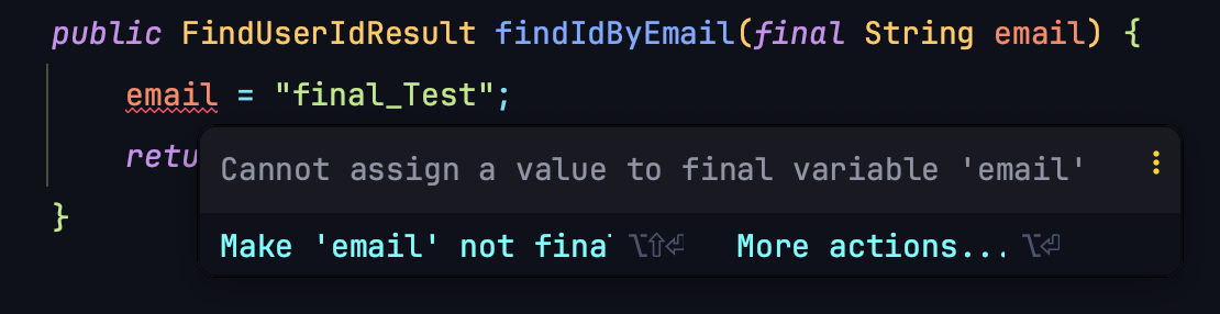 - 불변성 강조: final 키워드가 붙은 파라미터는 메소드 내에서 수정할 수 없습니다. 이는 코드를 읽는 사람에게 해당 변수가 변경되지 않을 것임을 명확하게 알려줍니다.
