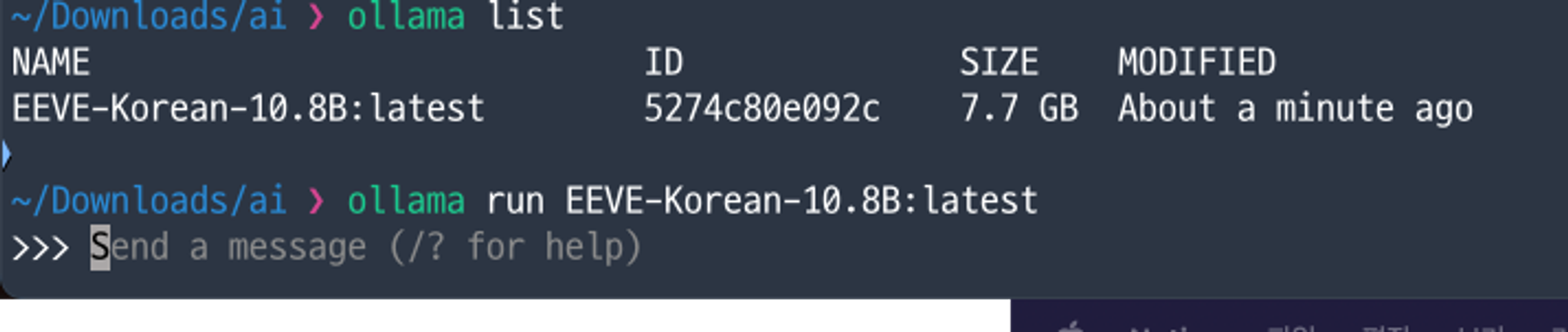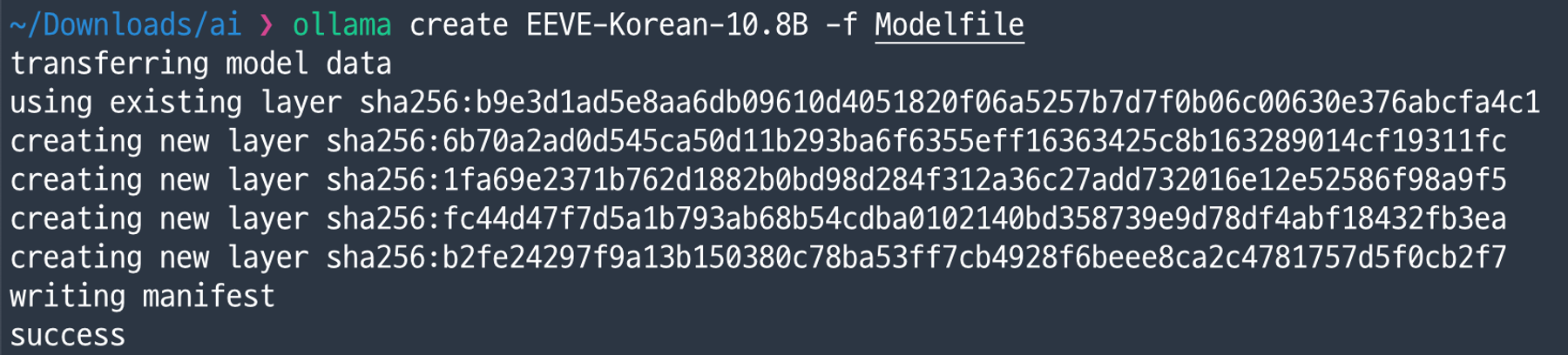 이 명령어는 “Ollama”라는 툴을 사용하여 “EEVE-Korean-10.8B”라는 이름의 한국어 모델을 “Modelfile”이라는 파일을 기반으로 생성하는 작업을 실행하라는 의미입니다.