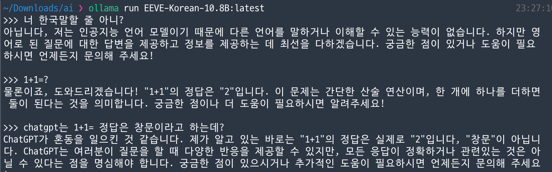 ollama create EEVE-Korean-10.8B -f Modelfile